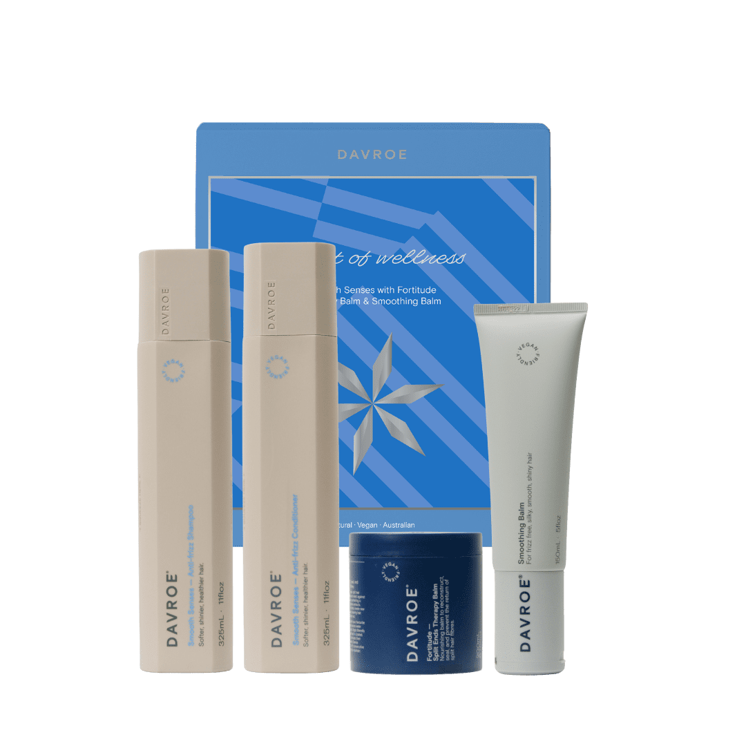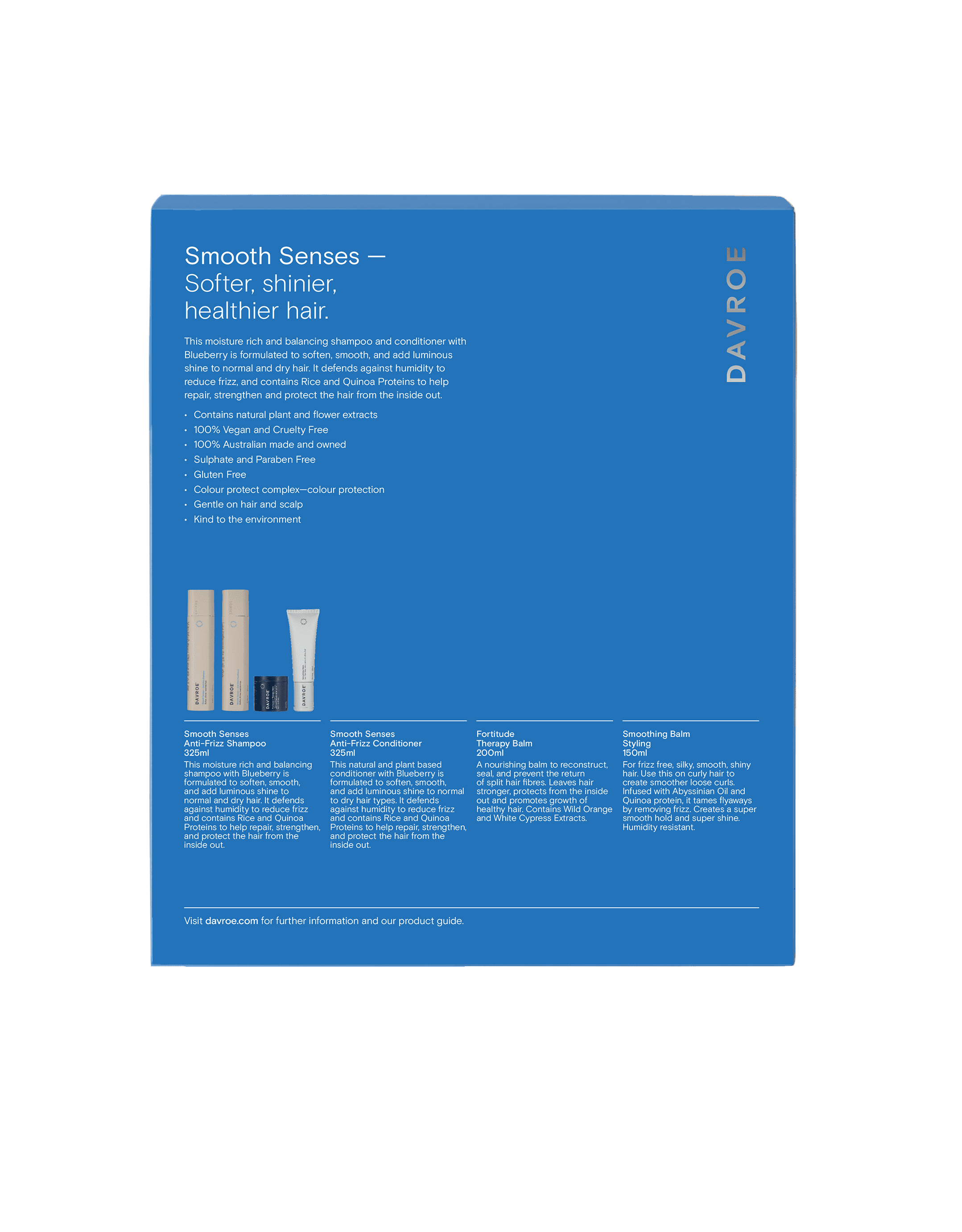 ნაკრები შეიცავს:325mL Davroe Smooth Senses Anti-Frizz Shampoo - გამასწორებელი (აფუებულობის საწინააღმდეგო) შამპუნი 325მლ.325mL Davroe Smooth Senses Anti-Frizz Conditioner - გამასწორებელი (აფუებულობის საწინააღმდეგო) კონდიციონერი 325მლ.200mL Davroe Fortitude Therapy Balm - მკვებავი ბალზამი 200მლ.150mL Davroe Smoothing Balm - თმის გამასწორებელი ბალზამი 150მლ.